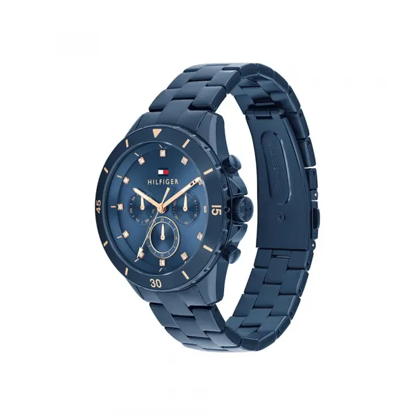 기술 사양: 브랜드: TOMMY HILFIGER 모델: Melli 성별: 여성 카테고리: 액세서리 서브 카테고리: 시계 무브먼트: 쿼츠 멀티펑션 디스플레이: 아날로그 기능: 요일, 날짜, 24시간 시간 서브 다이얼 다이얼 색상: 블루 케이스 직경: 40 mm 방수: 5 ATM (50 미터) 스트랩 유형: 브레이슬릿 잠금 장치 유형: 디플로이먼트 버클