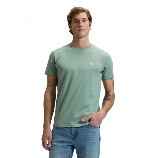 짧은 소매, 크루넥, 작은 패치 로고의 은은한 브랜딩이 특징입니다.
