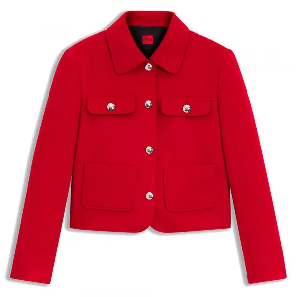 특징: - 레귤러 핏 - 잠금 방식: 버튼 여밈 - 버튼 개수: 4개 이상 - 플랩 가슴 포켓 - 상단 포켓: 패치 포켓 - 커프스 없음 - 벤트 없음 - 전체 안감 - 크롭 기장 사양: - 소재: 70% 폴리아크릴, 20% 폴리에스터, 10% 울, 안감: 55% 폴리에스터, 45% 비스코스, 소매 안감: 95% 폴리에스터, 5% 엘라스테인 세탁 정보: - 세탁 금지 - 표백 금지 - 회전식 건조 금지 - 낮은 온도 다림질 - 약한 드라이 크리닝