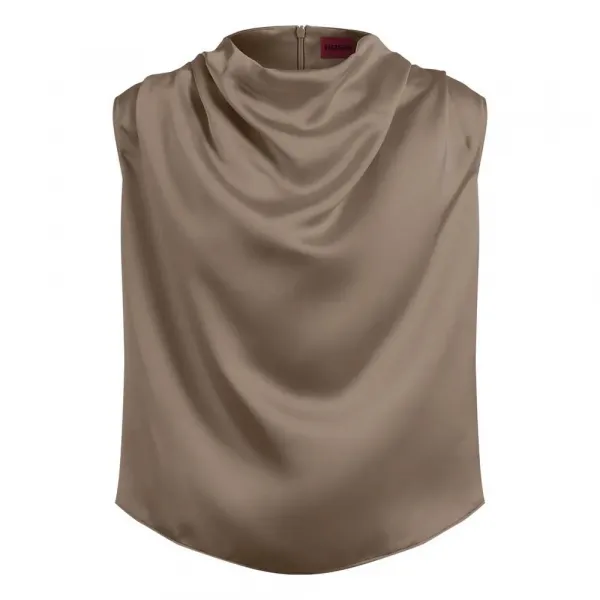 주요 특징: 드레이핑 네크라인의 민소매 탑.