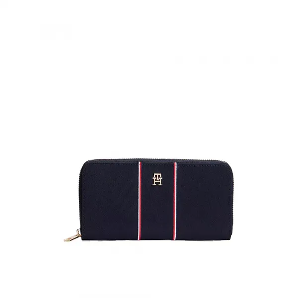 기술 사양: 제품 유형: 여성 지갑 카테고리: 액세서리 성별: 여성 주요 소재: 합성 소재 색상: 블랙 브랜딩: 전면에 메탈릭 Tommy Hilfiger 로고 플레이크 내부 레이아웃: 여러 개의 내부 카드 슬롯, 중앙 지퍼 동전 포켓, 여러 개의 지폐 수납 공간.