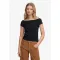 - 깊은 골지 오프숄더 네크라인 - 짧은 캡 소매 - 밑단 위 시그니처 메탈 탭 케어: - 30°C 약하게 세탁 - 표백 금지 - 건조기 사용 금지 - 저온으로 다림질 - 드라이클리닝 금지