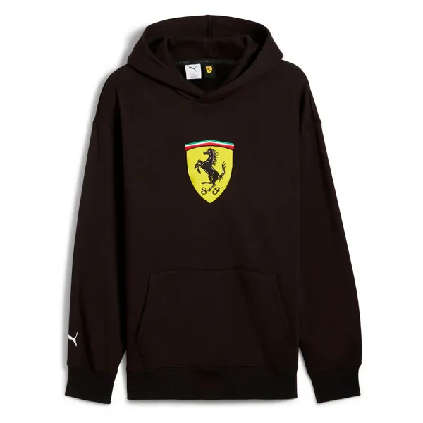 상징적인 페라리 쉴드 로고, 팔의 푸마 캣, 신축성 있는 밑단과 커프스, 캥거루 포켓이 특징입니다.