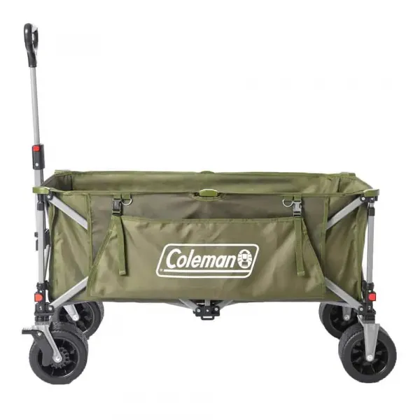 기술 사양: * 제품: 콜맨 얼티밋 테레인 카트 * 적재 용량: 최대 100kg (220파운드) * 핸들 유형: 잠금식 텔레스코픽 핸들 * 바퀴 유형: 트레드가 있는 오버사이즈 올터레인 바퀴 * 접힌 치수: 쉬운 보관을 위한 컴팩트한 프로필 * 펼쳐진 치수: 장비를 위한 충분한 공간 제공 * 특수 기능: 앞바퀴 브레이크, 쉬운 세척을 위한 탈부착 가능한 패브릭 라이너, 아코디언 스타일 폴딩 메커니즘, 운반 및 보관을 위한 휴대 가방 포함.