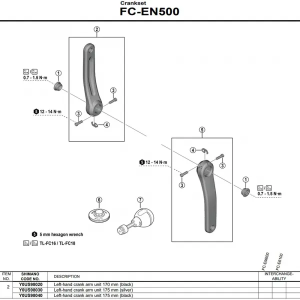 --- 기술 사양: * 브랜드: SHIMANO * 모델: FC-EN500 * 부품 번호: Y0US98020 * 측면: 좌측 * 범주: 자전거 부품 * 하위 범주: 크랭크 * 색상: 블랙 * 적용 분야: 전기 자전거 (트레킹, 시티) * 인터페이스: 스퀘어 타입 * 센서 통합: 센서 없음 * 권장 바텀 브래킷 (호환성 참조): BB-UN300, BB-UN101