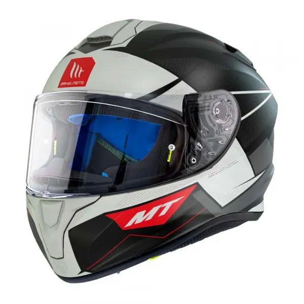 06 & DOT 승인 바이저 시스템: 광학적으로 정확한 스크래치 방지 폴리카보네이트 바이저 선 바이저: 통합 드롭다운 내부 선 바이저 잠금 시스템: 마이크로메트릭 퀵 릴리스 버클 내부: 탈착식, 세탁 가능, 저자극성 라이너 통풍: 채널형 흡기 및 배기구 무게: > 1501 gr MT Helmets Track SV Aries와 함께 다음 모험을 준비하세요.
