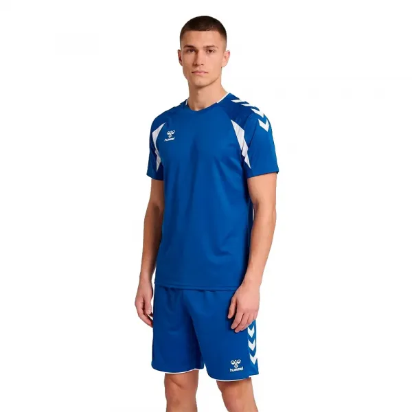 The jersey has raglan sleeves to improve range of motion, contrast panels on the shoulders, and the iconic hummel chevrons on the sleeves, highlighting the sporty teamsport look.