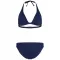 홀터넥 스타일 상의는 조절 가능한 스트랩과 뒷면의 버클로 고정됩니다.
